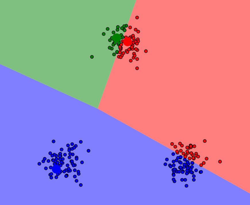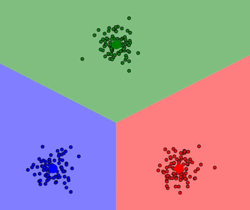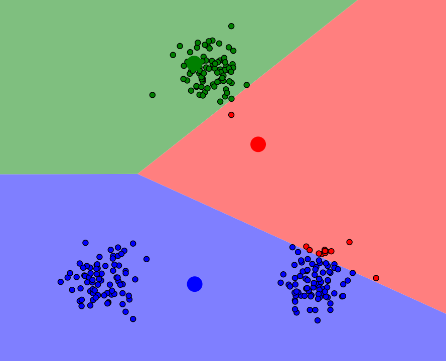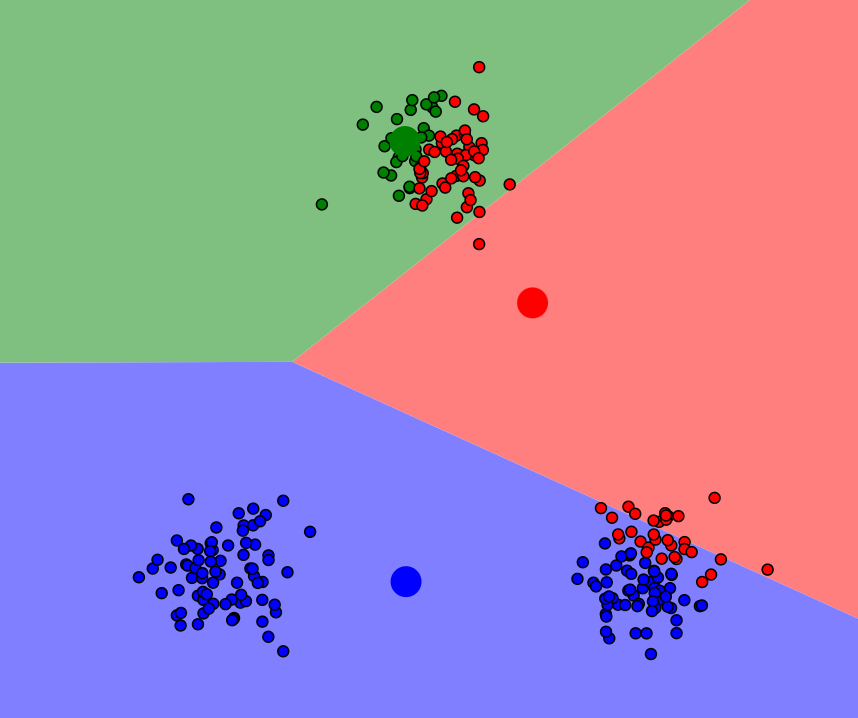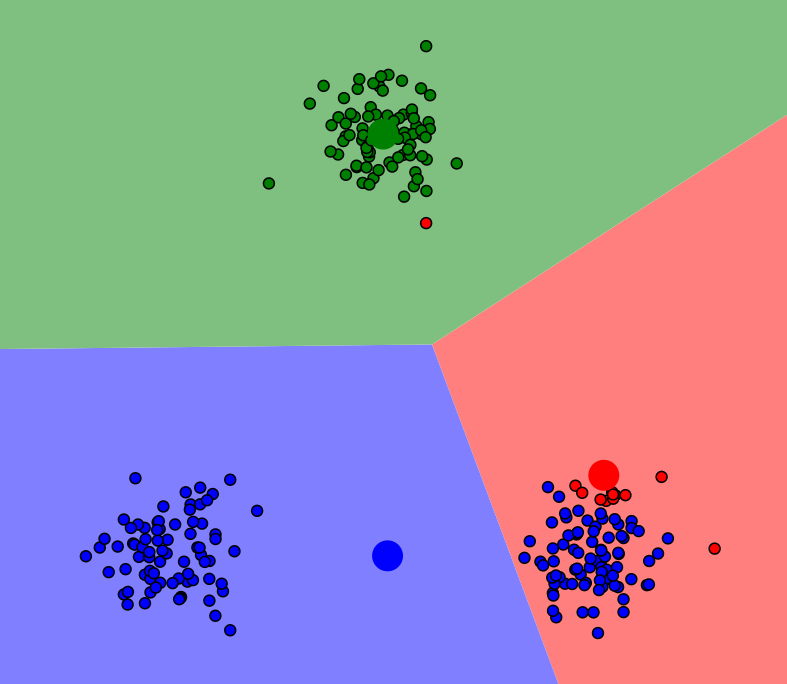 1.首先,选择k个初始聚类中心点(可以随机选择或根据经验选择,这里的k设置为3)。这里我们初始了三个聚类中心点(红绿蓝)