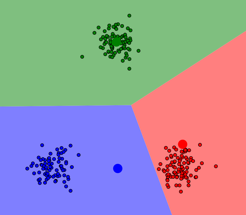 2.针对每个数据点,计算其与k个聚类中心点的距离(这里的k设置为3),将其归为距离最近的聚类中心点所在的类。这里可以看到数据被分为红绿蓝三个类别,加粗的为初始聚类中心点