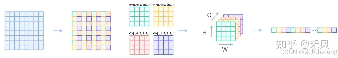- 输入的特征图会按照一定的步长(通常是 2)进行分割,即对每个 2×2 的 patch 进行合并。