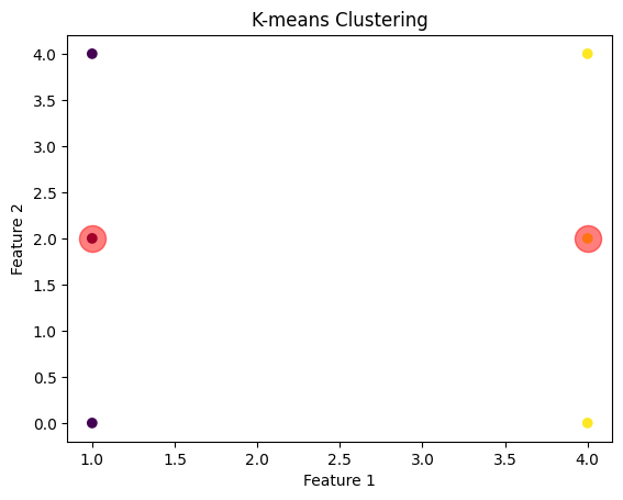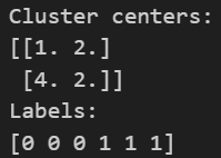 这段代码首先导入了必要的库,然后创建了一个二维数据集。接着,我们设置了聚类数K为2,并初始化了一个KMeans对象。之后,我们使用fit方法对数据进行拟合,并通过predict方法获取每个数据点的聚类标签。最后,我们打印出聚类中心和每个数据点的标签,并使用matplotlib进行可视化。