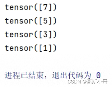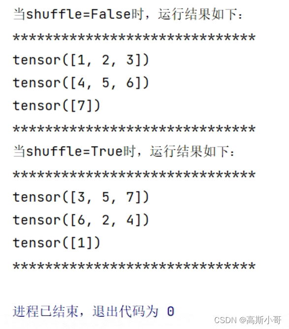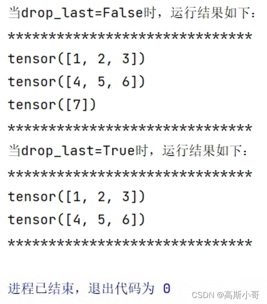 运行结果:可以看到,当drop_last=True时,最后一个批次的数据 tensor([7]) 被舍弃了。